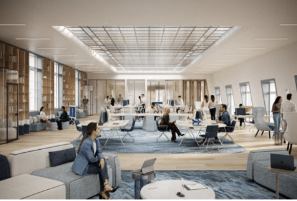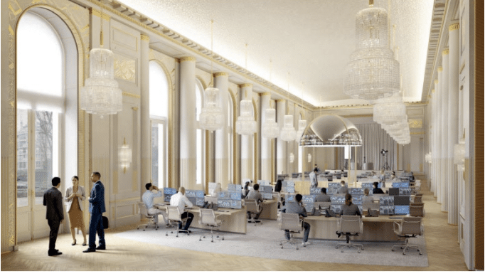 « Les espaces de travail s’inscrivent dans une architecture contemporaine et décloisonnée. Baignés de lumière naturelle, ces espaces offrent une grande flexibilité d’aménagement, avec des plateaux fonctionnels de 2 500 m2 et des hauteurs sous plafond pouvant atteindre 5 mètres. Certains bureaux s’ouvrent sur des terrasses dominant le jardin Potocki, un écrin de verdure d’une rareté inestimable, véritable respiration au cœur du bâtiment. L’ensemble, de 14 000 m2 de surface utile environ, soit une capacité de 1 900 personnes, intègre un socle de 1 200 m2 de services, incluant notamment un restaurant d’entreprise de prestige, un business center, deux cafés, ainsi qu’un espace fitness, pensé pour favoriser le bien-être au travail. Les espaces historiques, entièrement restaurés, peuvent accueillir différents usages (salles de réunion, événementiel, showroom…) dans un décor patrimonial ».